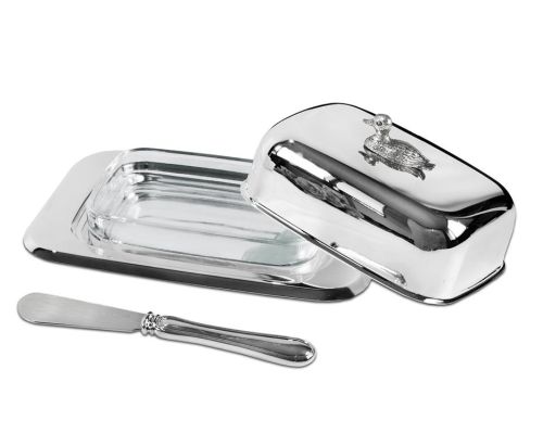 Die Butterdose Ente der Marke EDZARD ist versilbert und wird mit einem Glaseinsatz geliefert. Sie erhalten die Butterdose mit einem Buttermesser im Set. Das passende Buttermesser liegt gut in der Hand aufgrund des runden Griffes. Die Butterdose ist mit einer Entenfigur verziert.