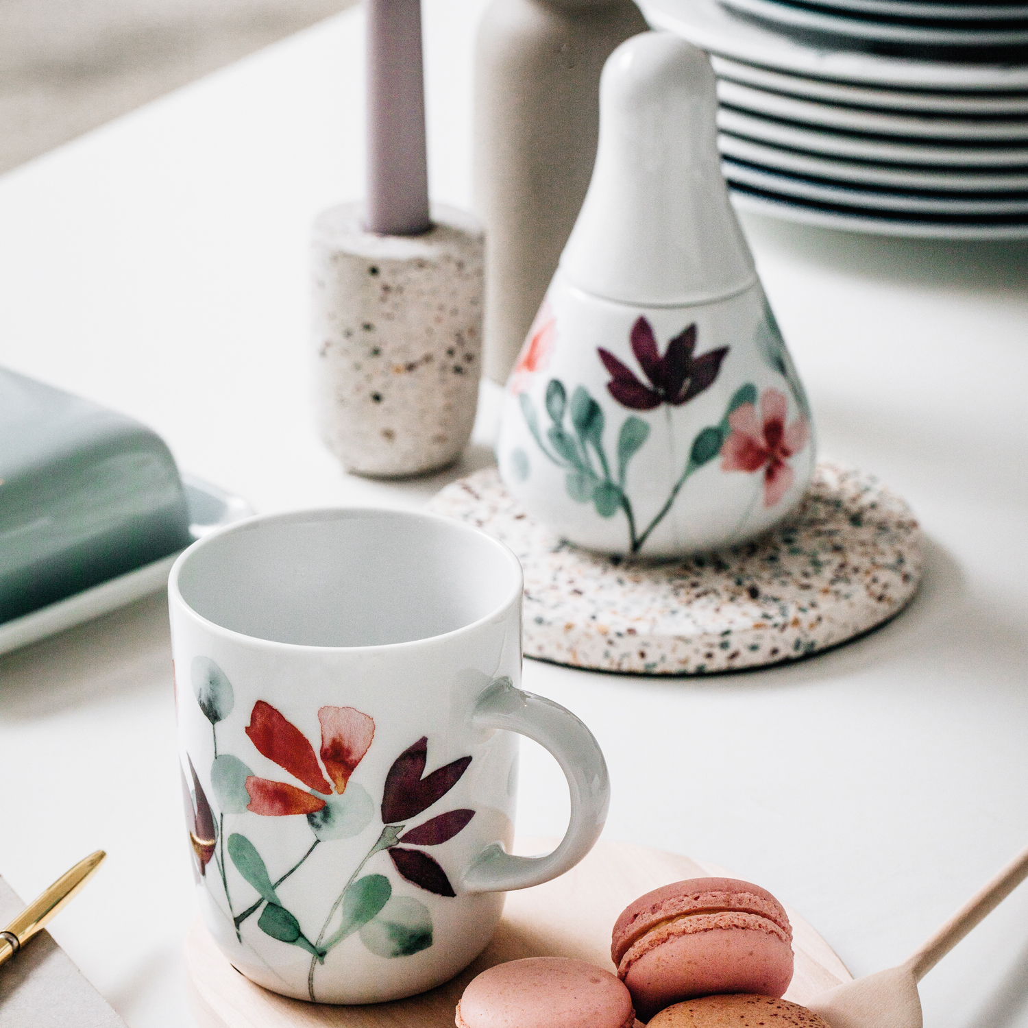 Die Energie der Achtsamkeit holt Lisa Keller mit dem Dekor Heyday auf den gedeckten Tisch und breitet einen fein aquarellierten Blütenteppich aus, der Samtgrün, Aubergine, Rosé und Magenta in irisierenden Farbverläufen verbindet. In den Blüten und Knospen treffen gedeckte und leuchtende Töne, warme und kalte Nuancen aufeinander. Hier begegnen sich Ruhe und Vitalität, wie sie Lisa Keller beim achtsamen Betrachten der Natur findet. Das englische Wort „heyday“ steht dabei für den Höhepunkt der Blütezeit und drückt die sinnliche Wahrnehmung maximaler Lebensenergie aus. Perfekt dazu passen die Geschirrteile der Serie Pronto.