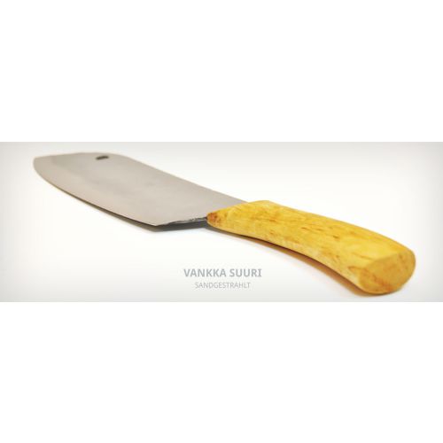 Das Messer Vankka Suuri sandgestrahlt der Marke Nordklinge ist aus Karbonstahl mit einem Griff aus karelischer Maserbirke gefertigt. Das Messer hat eine Gesamtlänge von 34,8 cm, wobei die Klinge eine Länge von 18,9 cm hat. Karbonstahl oxidiert durch Wasser und Säuren und bildet im Laufe der Zeit eine Patina, die geschmackneutral ist und ein Zeichen für höchste Schärfleistung ist. Das Messer wird bei der Schleiferei Kubesch nachgeschliffen und gewinnt somit an Schneidfähigkeit. Mit der erhöhten Schneidfähigkeit wird die Klinge dünner. Deshalb dürfen Knochen, verholzte Kräuter und gefrorene Lebensmittel mit diesem Messer nicht verarbeitet werden. Die Klinge wurde sandgestrahlt.