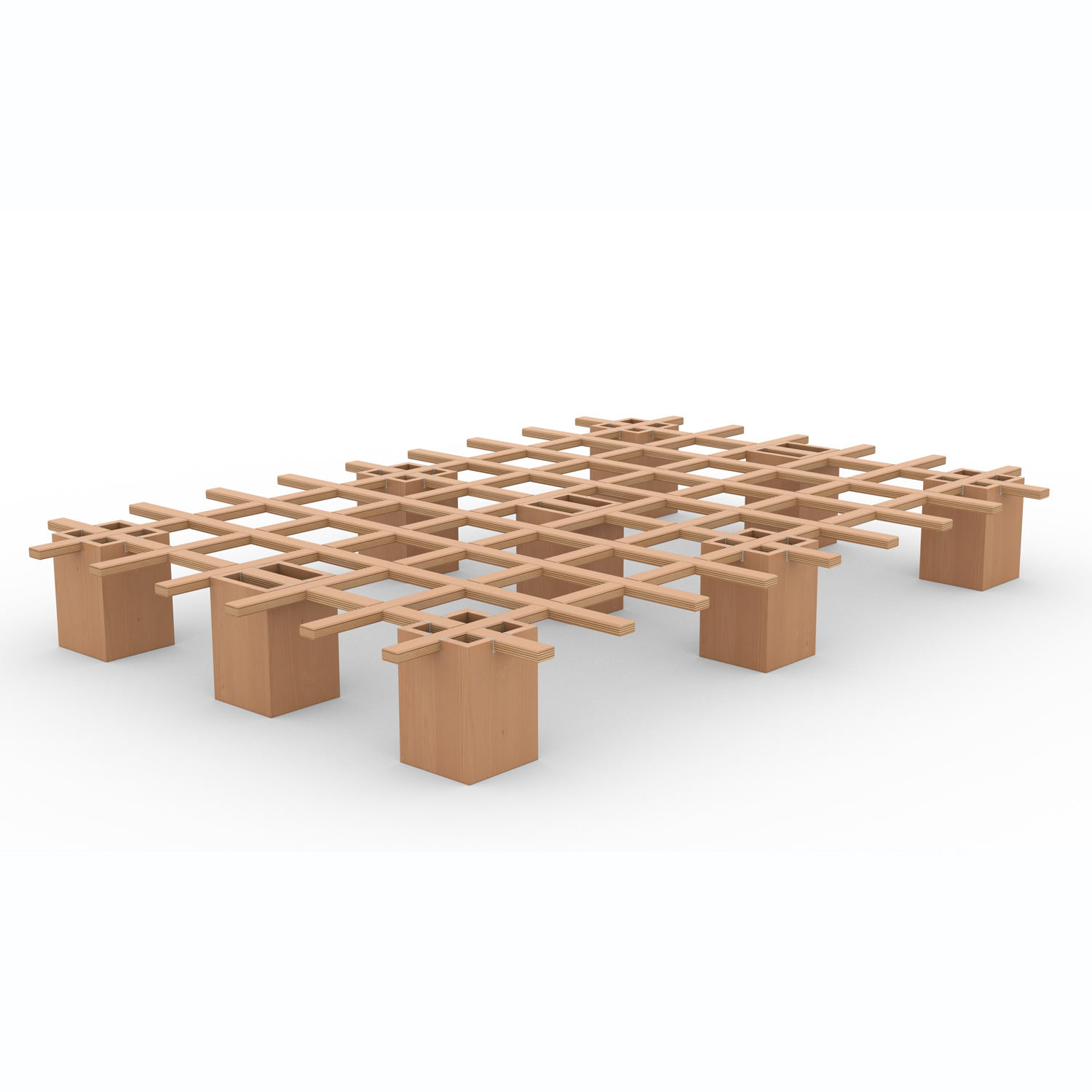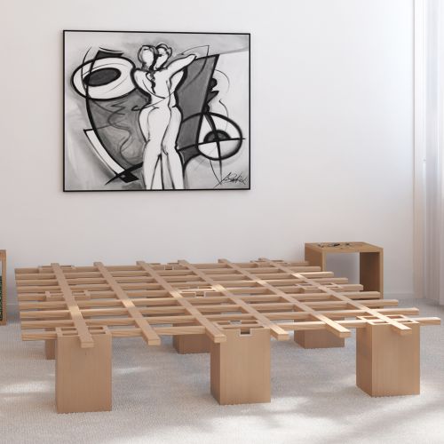 Das Bett Tojo-system ist aus Buche multiplex natur gefertigt. Das Bett besteht aus einzelnen Latten und Füßen. Die Latten werden einfach auf die Füße gelegt und zusammengesteckt. Das Bett lässt sich einfach demontieren und platzsparend verstauen. Ganz ohne Schrauben nur mit Steckverbindungen lässt sich das Bett aufbauen. Matratzen bis zu einer Länge von 200cm können verwendet werden. Das Design stammt von Tojo. Wählen Sie aus verschiedenen Größen.