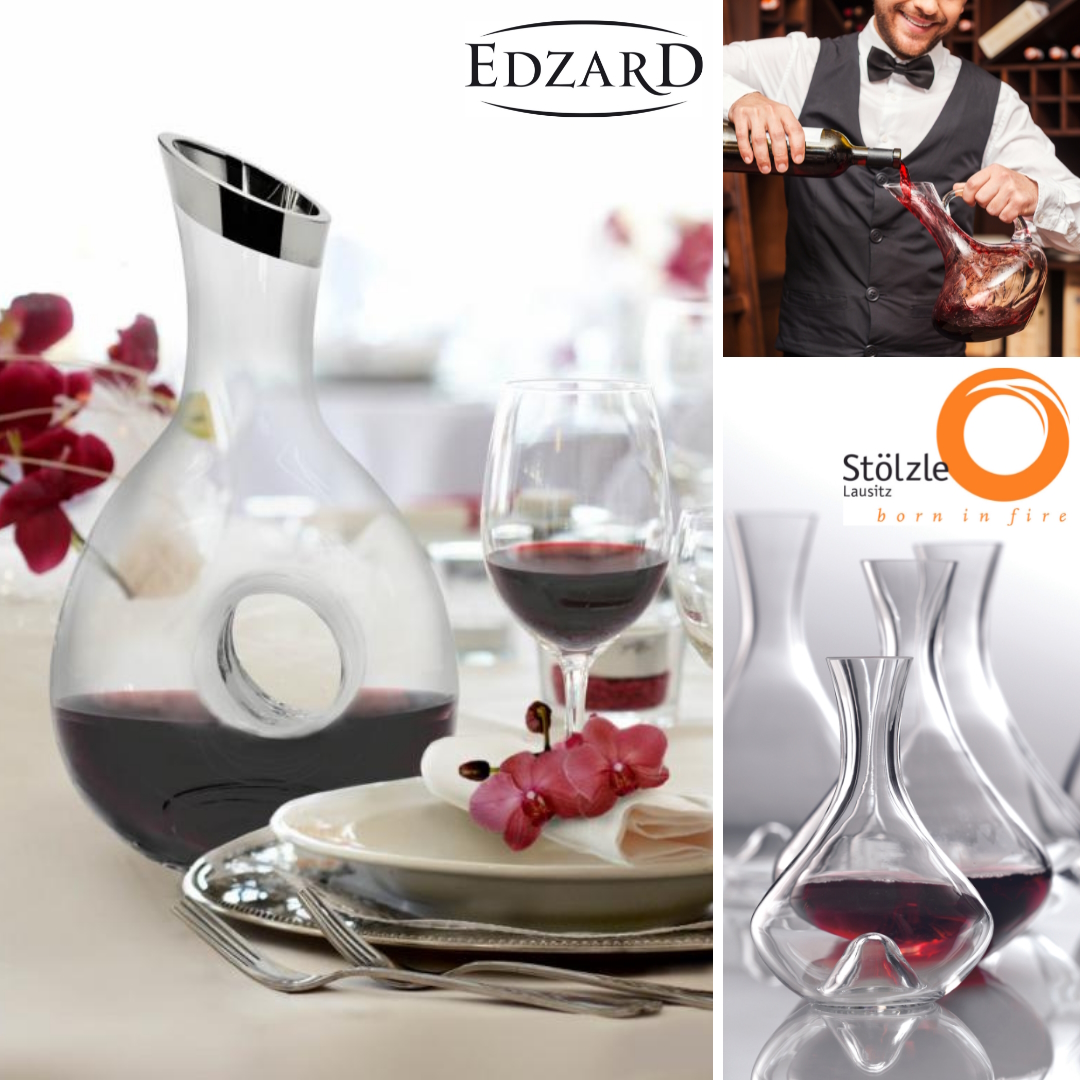 Ein Dekanter ist eine besondere Form der Weinkaraffe mit einem dünnen Hals und einem bauchigen unteren Teil. Er ist aus stabilem Glas hergestellt und verfügt über einen Verschluss sowie meist auch über eine Ausschankhilfe. Wenn kein Dekantier Ausgießer vorhanden ist, können Sie diesen extra erwerben. Früher diente ein Dekanter dazu, um den Wein von Schwebstoffen zu befreien. Dies geschah beim Umfüllen des Weins, indem die Rückstände, wie etwa Überbleibsel vom Weinstein, am Boden des Dekanters gesammelt wurden. Bei den jüngeren Weinen ist dies meist nicht mehr notwendig. Heutzutage dient der Dekanter dem Belüften von Rotwein. Nach dem Umgießen in diese spezielle Karaffe tritt ein Nachreifeprozess ein, der auf dem Zusammentreffen des Weins mit Sauerstoff basiert. Um das volle Bouquet bei einem nicht dekantierten Wein herauszuholen, müsste dieser ca. zehn Stunden im Glas verweilen. Doch welcher Weinliebhaber bringt schon diese Geduld auf. Ein Dekanter verkürzt die Wartezeit enorm, denn bedingt durch seine bauchige Form findet eine vermehrte Sauerstoffaufnahme und somit eine deutlich schnellere Nachreifung des guten Tropfens statt. In unserem Shop finden Sie Dekanter unter den Marken Stölzle und Edzard.